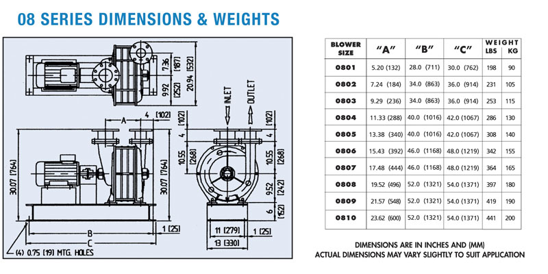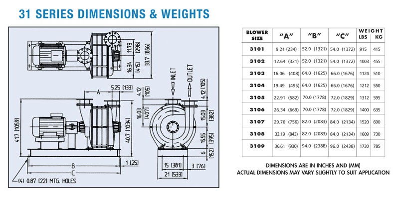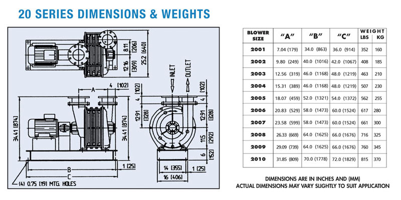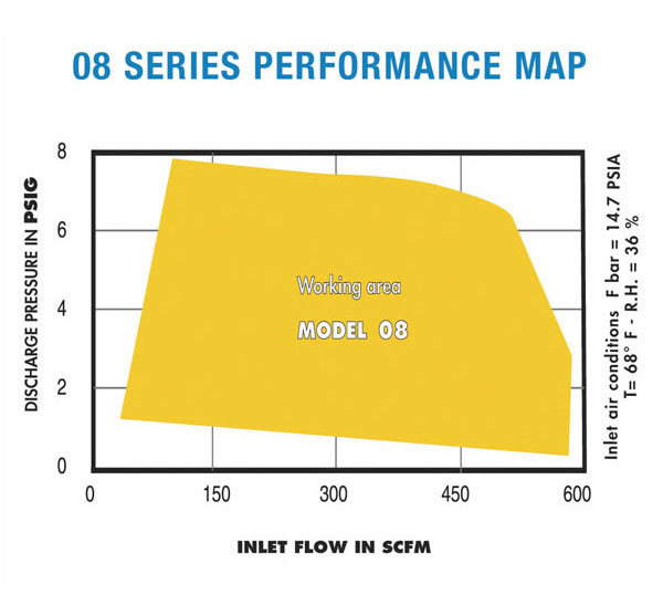 Number Of Stages: 1 thru 8 (cast) - 1 thru 11 (fabricated) Inlet Connection: 8" (202 mm) flange, matches 125# ANSII Outlet Connection: 8" (202 mm) flange, matches 125# ANSII Operating Speed: 3550 rpm in direct drive (60Hz) Lubrication: Oil type with constant level (grease optional) Drive: Direct drive or gear box or V-belts Vibration Tolerance: 1.25 mils peak-to-peak (4.5 mm /s) Shaft End: 2" 3/8 (60 mm ), inlet end drive standard