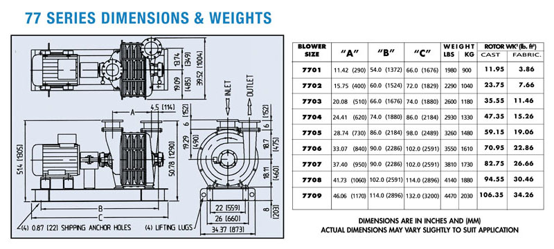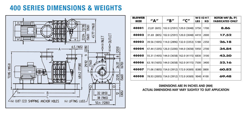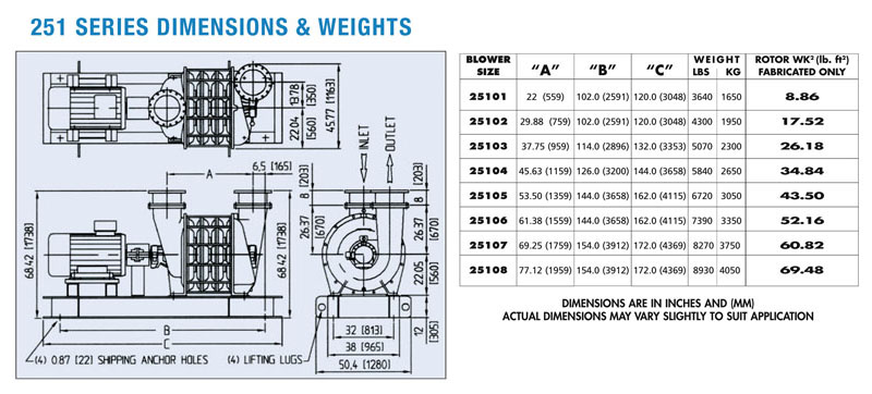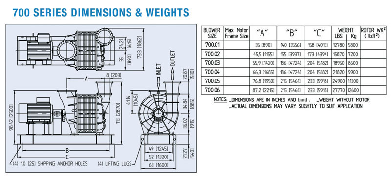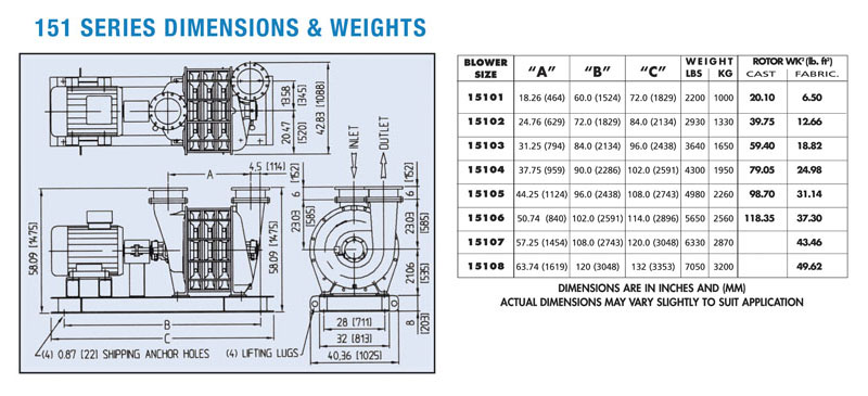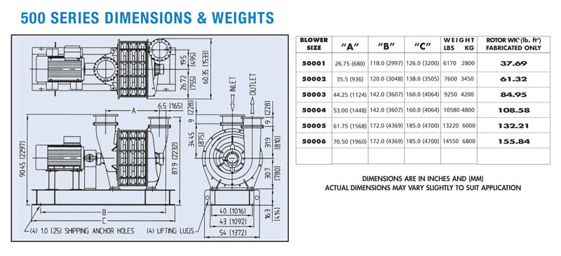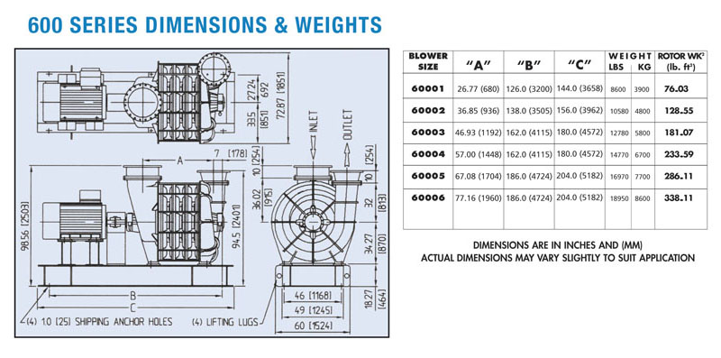 Inlet Connection: 6" (152 mm) flange, matches 125# ANSI Outlet Connection: 6" (152 mm) flange, matches 125# ANSI Operating Speed: 3600 rpm in direct drive (60Hz) Vibration Tolerance: 1.25 mils peak-to-peak (4.5 mm /s) Shaft End: 1" 3/4 (45 mm), inlet end drive standard