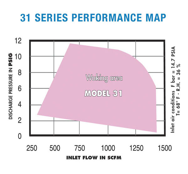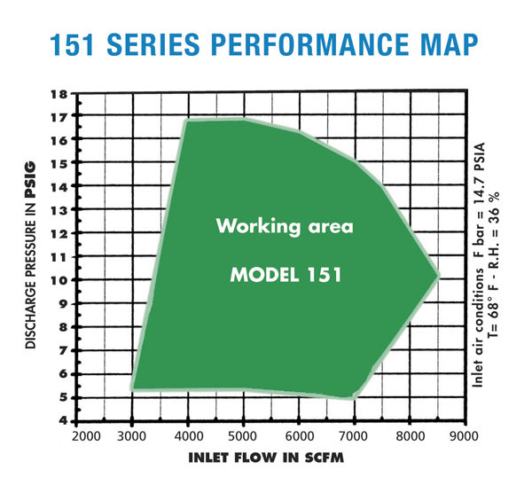 Inlet Connection: 18" (455 mm) flange, matches 125# ANSI Outlet Connection: 14" (356 mm) flange, ANSI 125# drilling Operating Speed: 3550 rpm in direct drive (60Hz) Lubrication: Oil type with constant level Drive: Direct drive or gear box or V-belts Vibration Tolerance: 1.25 mils peak-to-peak (4.5 mm /s) Balance Piston: From 4 to 8 stages with pipe connection Shaft End: 2" 9/16 (65mm) diameter, inlet end drive standard
