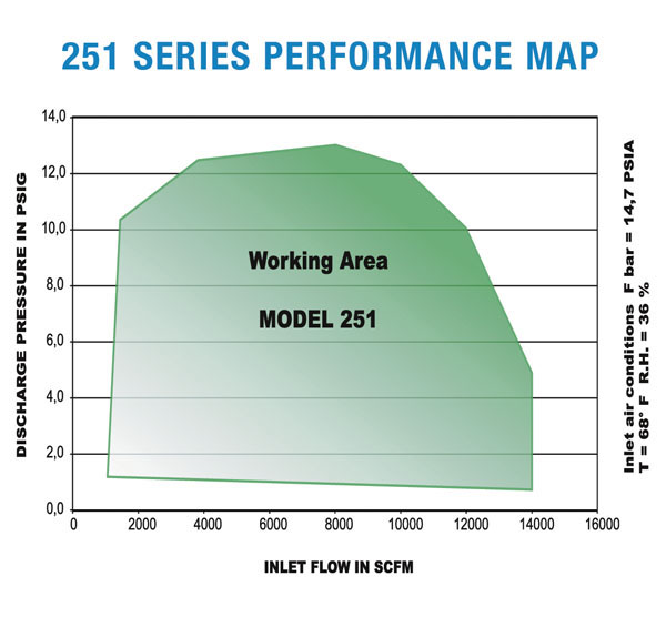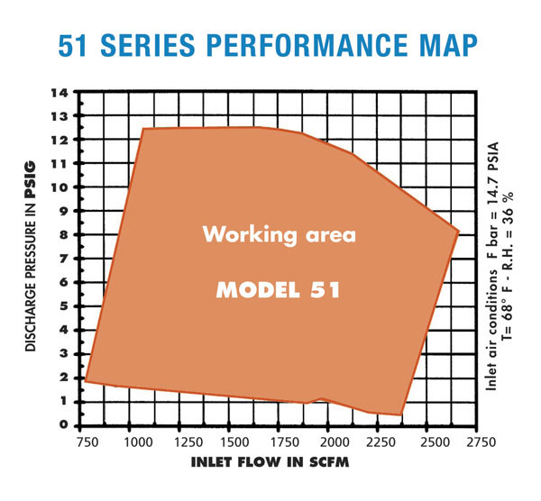 Inlet Connection: 14" (356 mm) flange, ANSI 125# drilling Outlet Connection: 14" (356 mm) flange, ANSI 125# drilling Operating Speed: 3550 rpm in direct drive (60Hz) Lubrication: Oil type with constant level Drive: Direct drive or gear box or V-belts Vibration Tolerance: 1.25 mils peak-to-peak (4.5 mm /s) Balance Piston: From 5 to 8 stages with pipe connection Shaft End: 2" 9/16 (65mm) diameter, inlet end drive standard