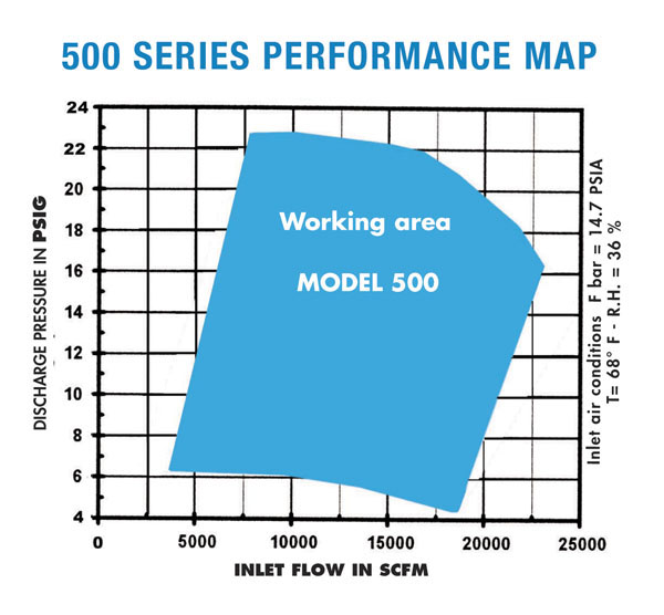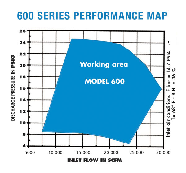 Inlet Connection: 24" (612 mm) flange, matches 125# ANSI Outlet Connection: 20" (511 mm) flange, matches 125# ANSI or 18" (460 mm) flange, matches 125# ANSI Operating Speed: 3550 rpm in direct drive (60Hz) Lubrication: Oil type with constant level Vibration Tolerance: 1.25 mils peak-to-peak (4.5 mm /s) Balance Piston: From 3 to 6 stages with pipe connection Shaft End: 3" 3/4 (95 mm), inlet end drive standard